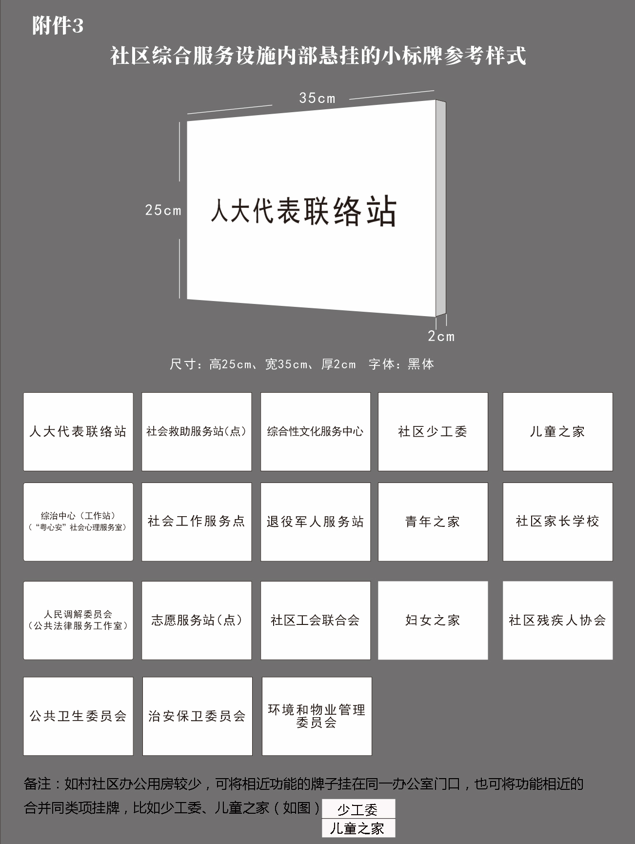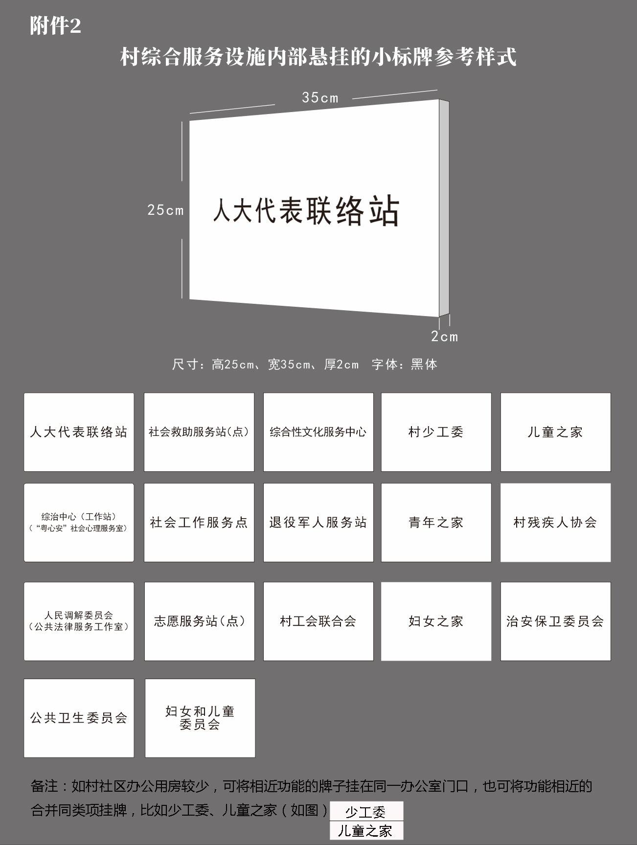 3.村级组织根据实际情况确定村级综合服务设施内部悬挂的标牌,一般在内部显著位置悬挂人大代表联络站、综治中心(工作站)、村民委员会各下属委员会、社会救助服务站(点)、社会工作服务点、志愿服务站(点)、综合性文化服务中心、退役军人服务站、村工会联合会、村少工委、青年之家、妇女之家、儿童之家、社区家长学校、村残协等15类标牌。其中,综治中心加挂“‘粤心安’社会心理服务室”标牌;人民调解委员会加挂“公共法律服务工作室”标牌,在综合服务大厅设置便民服务站标识和集合式服务功能指引标牌,在各功能区域入口悬挂简明标牌(详见附件2、3、4)。具体名称按照省市级有关部门要求落实,具体式样按照《河源市民政局中共河源市委组织部中共河源市委农村工作领导小组办公室关于进一步规范村级组织工作事务、机制牌子和证明事项实施方案的通知》(河民〔2023〕63号)要求执行。