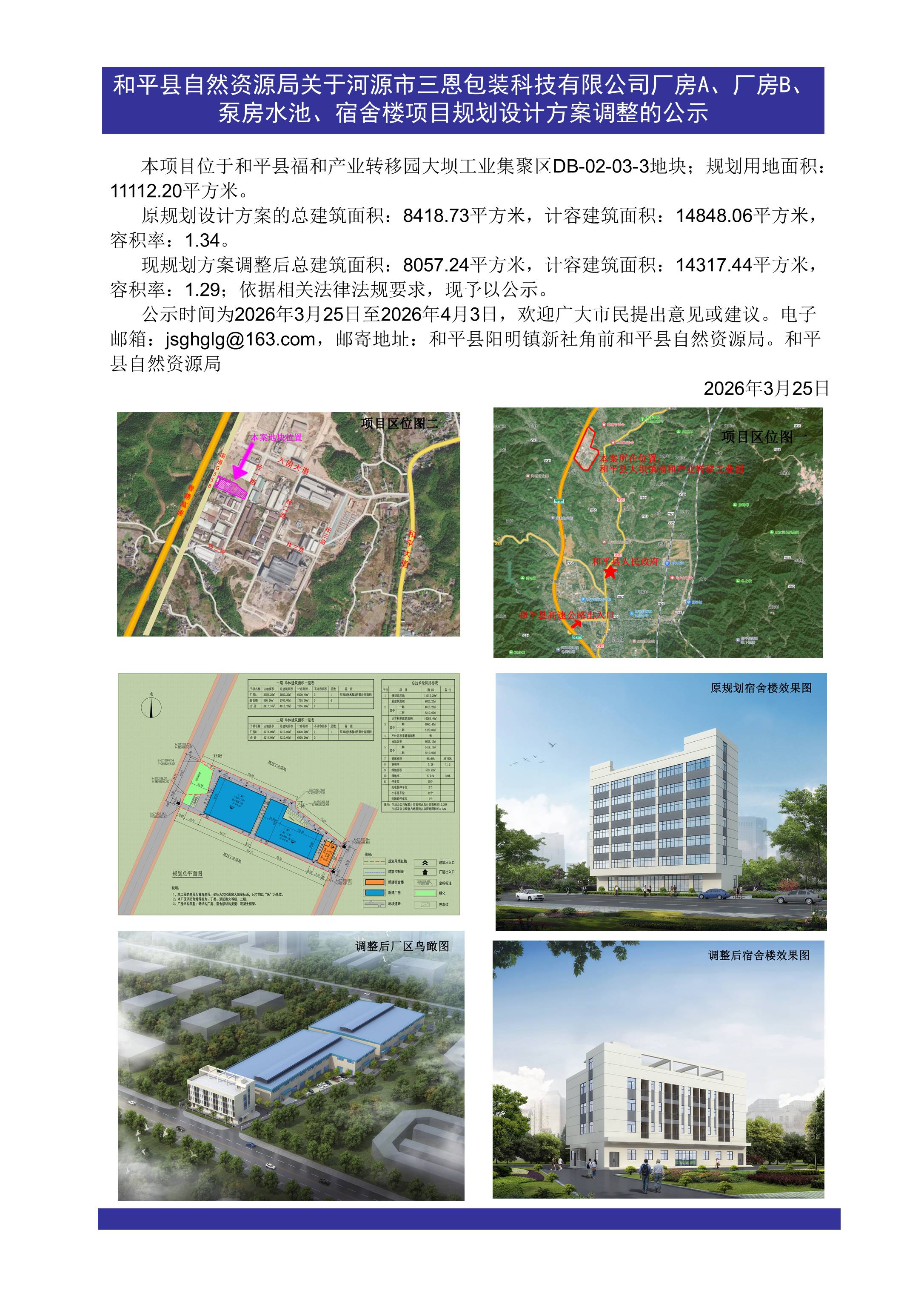本项目位于和平县福和产业转移园大坝工业集聚区DB-02-03-3地块,规划用地面积:11112.20平方米。原规划设计方案的总建筑面积:8418.73平方米,计容建筑面积:14848.06平方米,容积率:1.34;现规划方案调整后总建筑面积:8057.24平方米,计容建筑面积:14317.44平方米,容积率:1.29。依据相关法律法规要求,现予以公示。