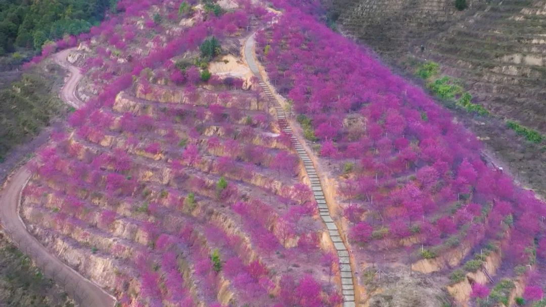 据了解,虎竹嶂梯田花海总面积1500余亩,观花品种有中国红樱、广州樱、黄花风铃木和紫玉兰等品种。其中中国红樱面积约300亩,目前已到达最佳观赏期。接下来,广州樱、黄花风铃木等品种将会陆续绽放,整个梯田花海的花期可达两个月。