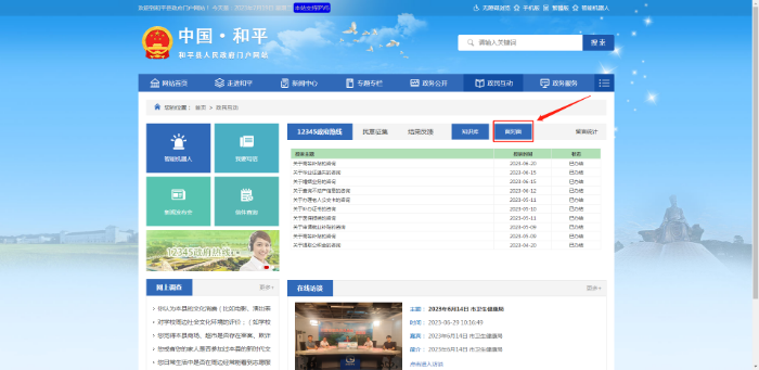 (二)网站:打开和平县人民政府门户网站,在“政民互动”版块点击“面对面”按钮,扫码登录后,根据提示要求输入内容并提交(网址:http://www.heping.gov.cn/zmhd/index.html)。