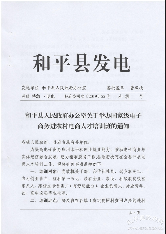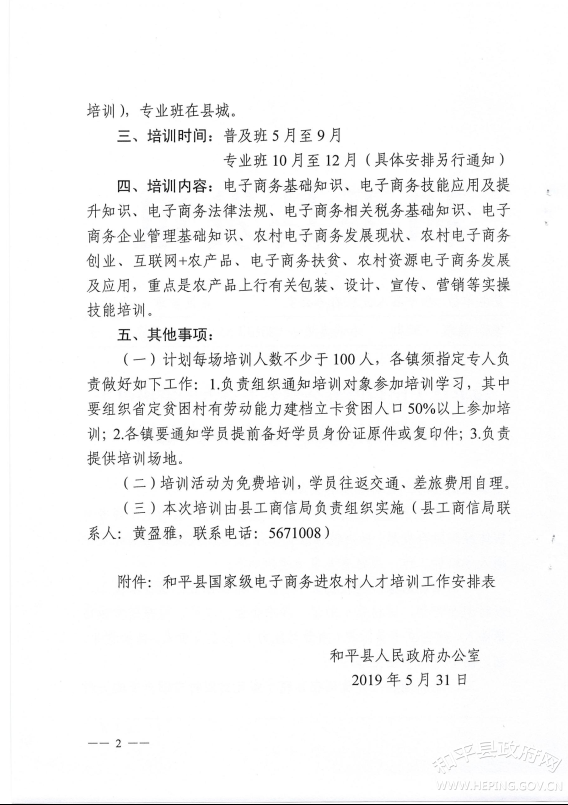 和平县人民政府办公室关于举办国家级电子商务进农村电商人才培训班的通知