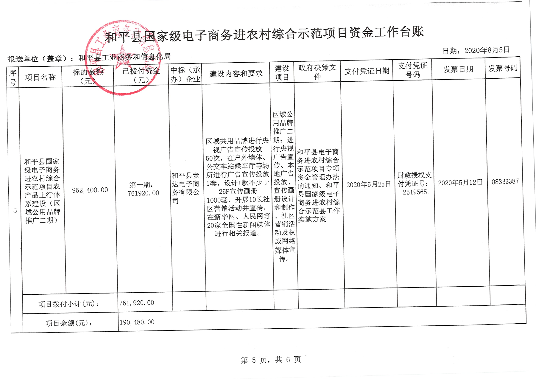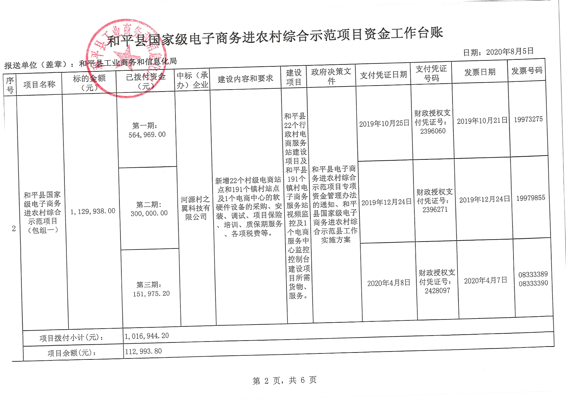 和平县国家级电子商务进农村综合示范项目资金工作台账(2020年8月)