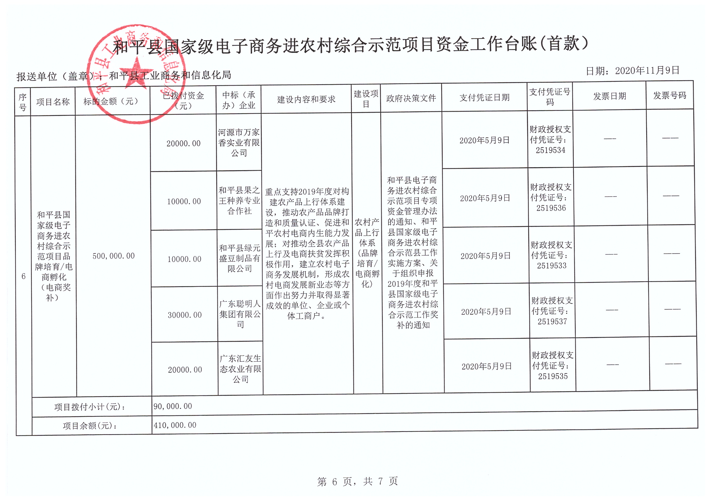 和平县国家级电子商务进农村综合示范项目资金工作台账(2020年11月)