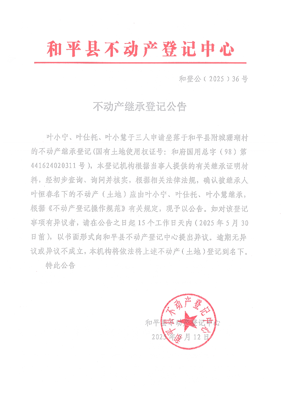 关于叶小宁、叶仕托、叶小慧申请不动产继承登记公告
