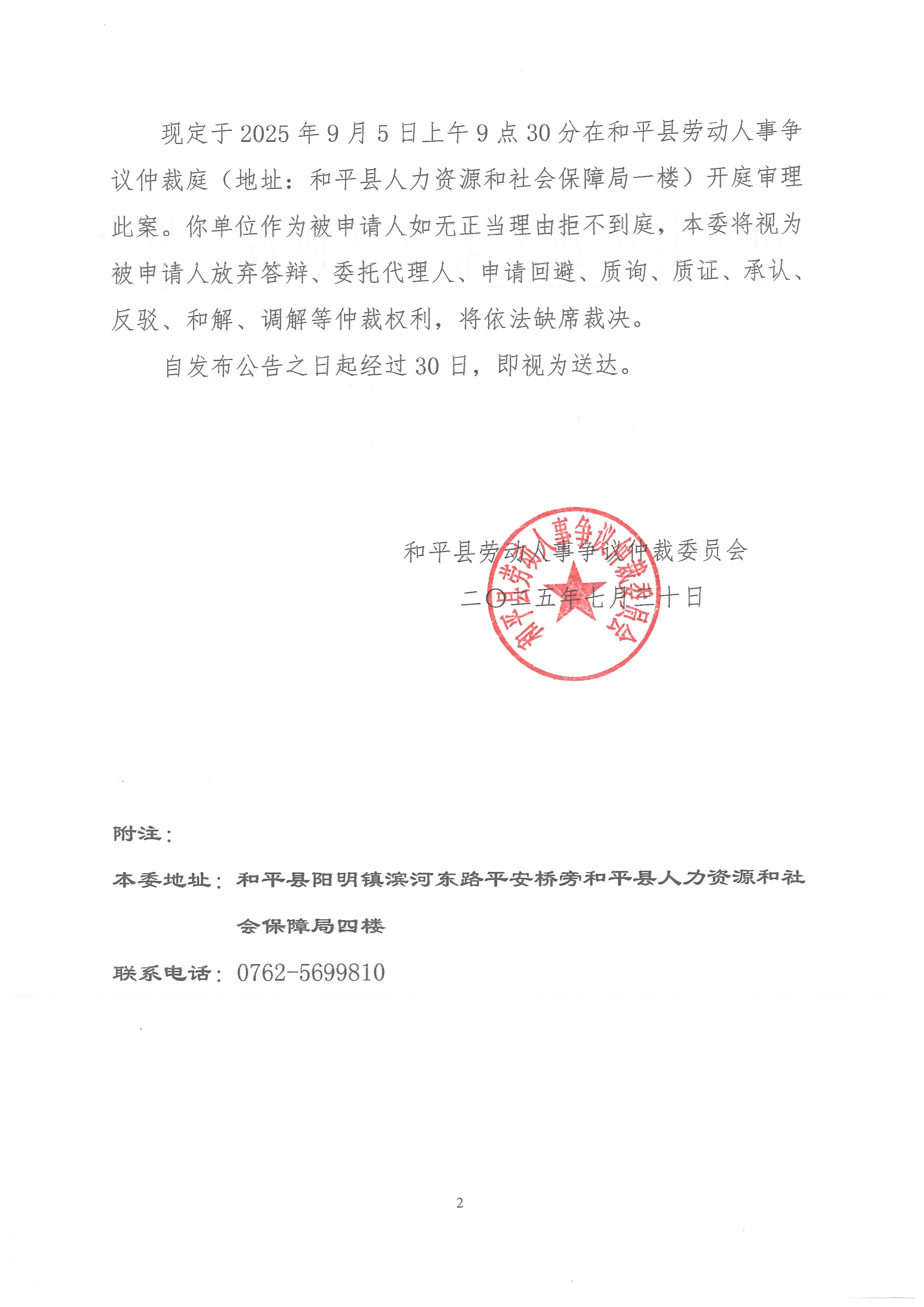 关于黄建华、黄小拉、黄秀娥、程楚文、戴德城诉河源市亿源通房地产开发有限公司仲裁开庭应诉通知 作者: 来源:和平县人力资源和社会保障局 发布时间:2025-07-30 浏览次数:-次 【字体:小 大】 分享到: 【打印正文】