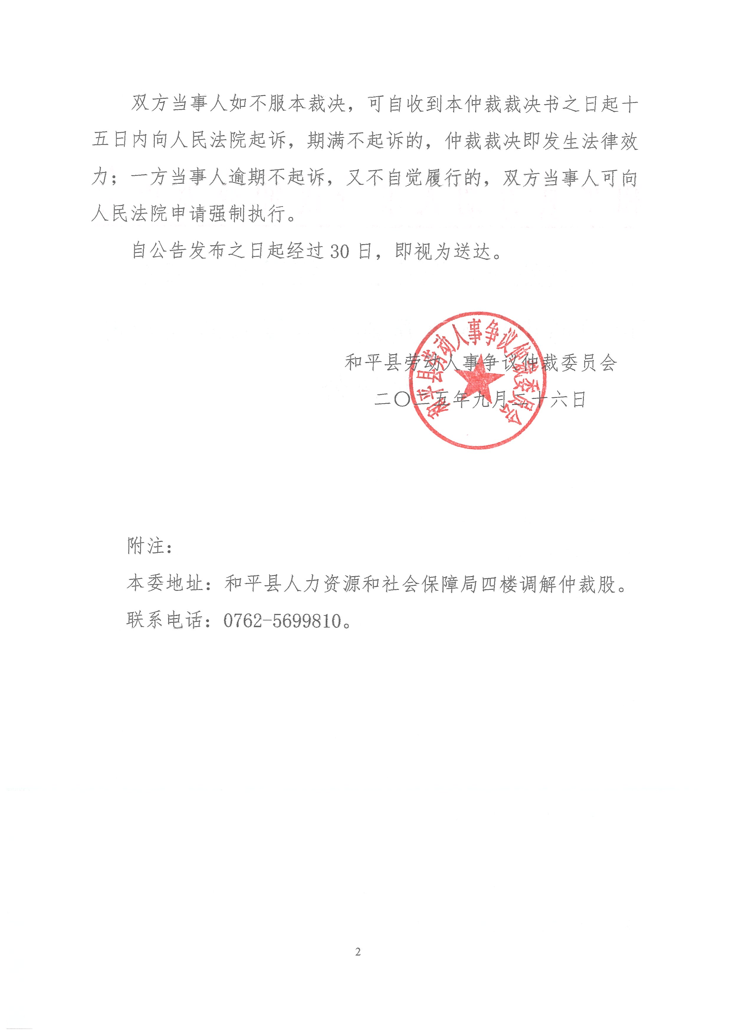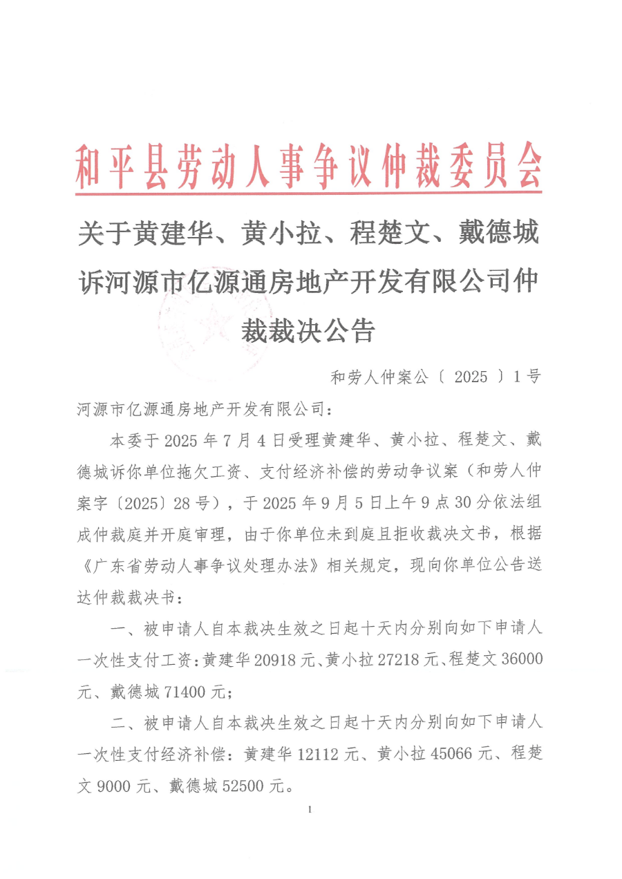 关于黄建华、黄小拉、程楚文、戴德城诉河源市亿源通房地产开发有限公司仲裁裁决公告 作者: 来源:和平县人力资源和社会保障局 发布时间:2025-09-26 浏览次数:-次 【字体:小 大】 分享到: 【打印正文】