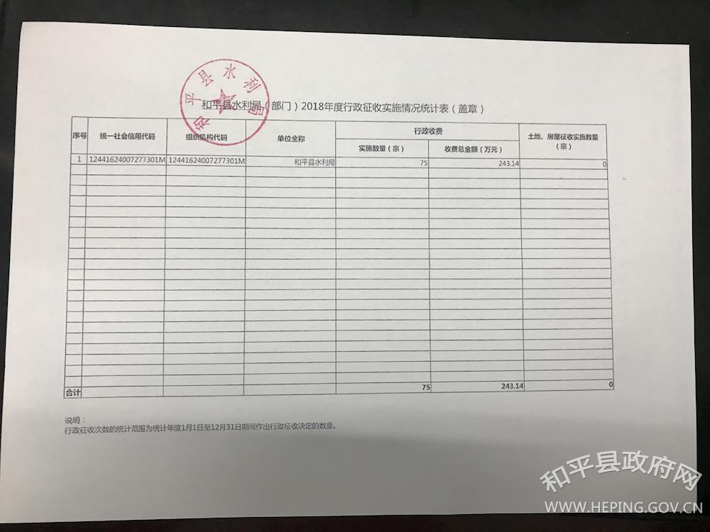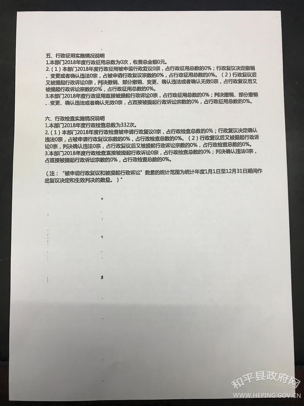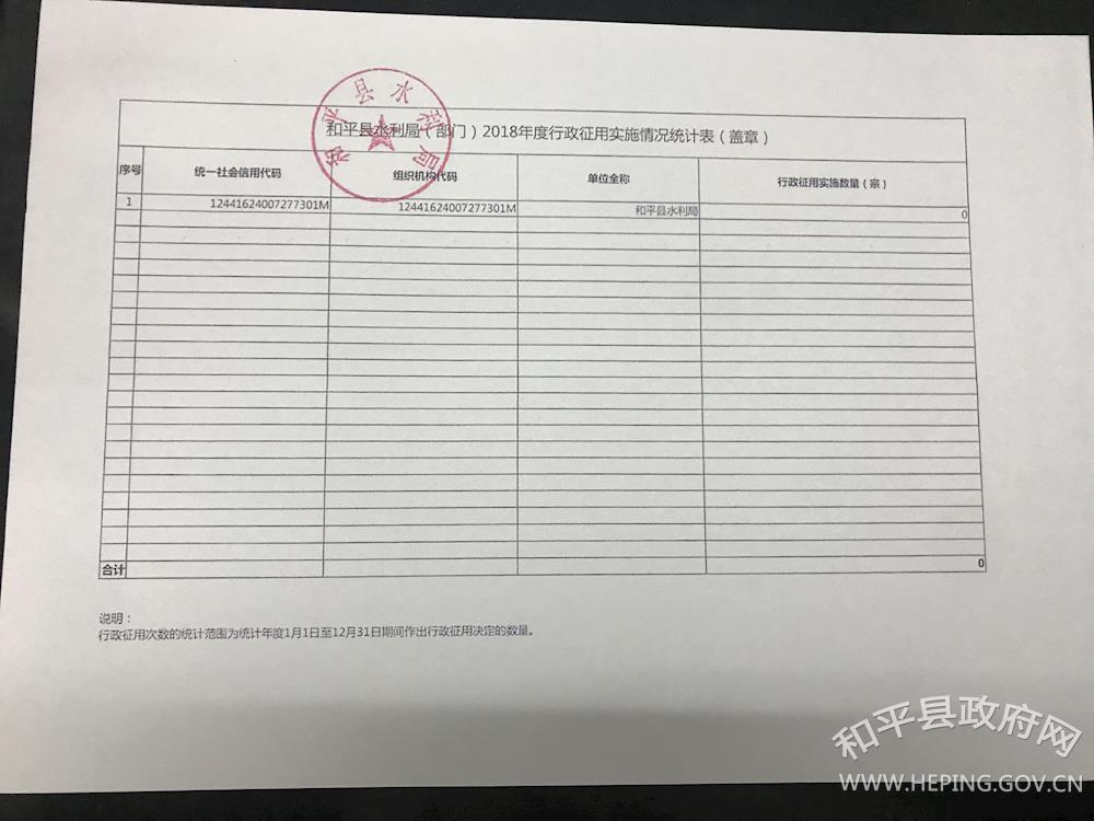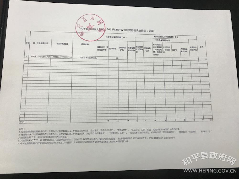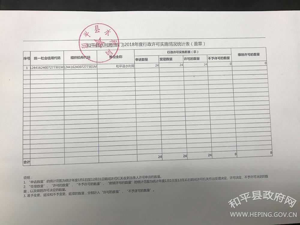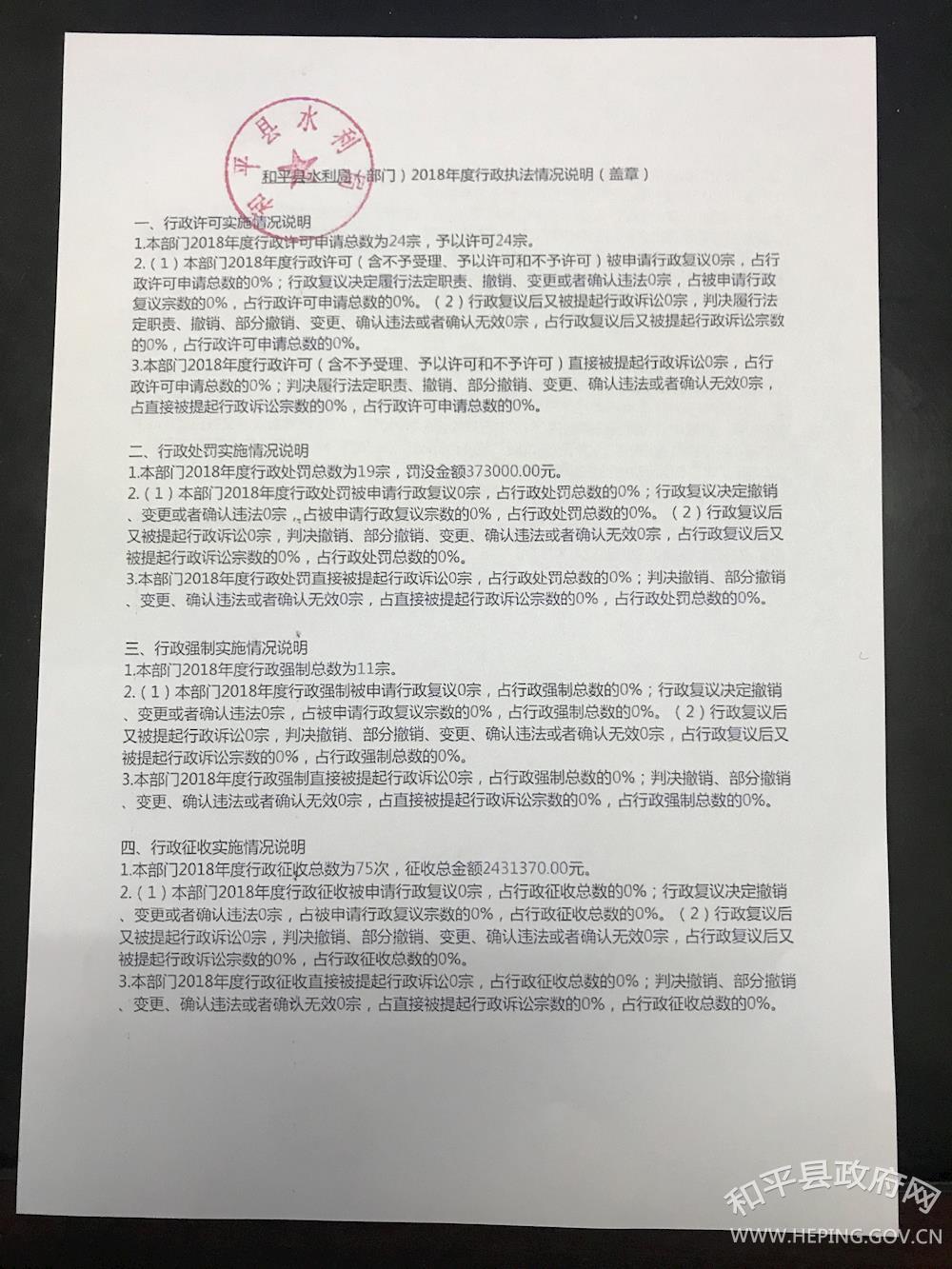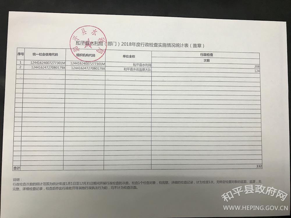 和平县水利局2018年度行政执法情况说明 作者: 来源:县水利局 发布时间:2019-02-01 浏览次数:-次 【字体:小 大】 2018年度行政征收实施情况统计表2018年度行政检查实施情况统计表2018年度行政征收实施情况统计表2018年度行政强制实施情况统计表2018年度行政处罚实施情况统计表 和平县水利局 2019年2月1日 分享到: 【打印正文】